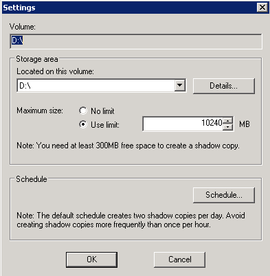 VSS settings are accessed by opening the properties of any drive in your server and selecting the Shadow Copies tab.