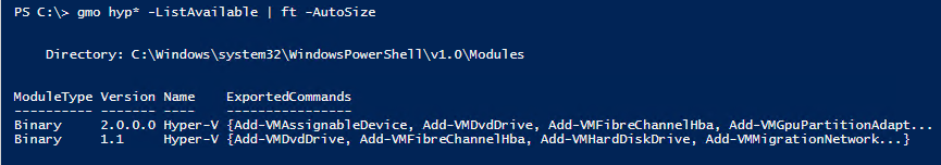 In writing, I've noticed that Windows 10 as well as Windows Server 2016 both ship with two Hyper-V modules. The two modules are version 1.1 and 2.0.0.0, as you can see here: